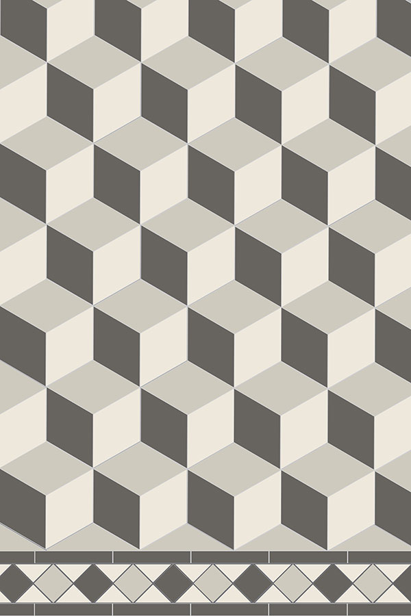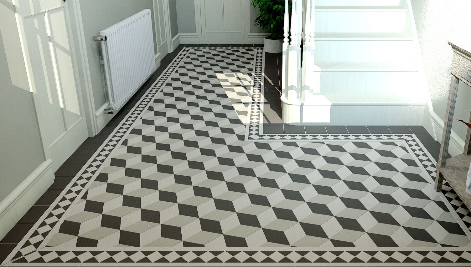 Bloomsbury with Kingsley border in black, chester mews, and dover white. A Victorian floor tile pattern with just one diamond shape, ideal for creating an illusion that makes it look like it’s fading into the distance.