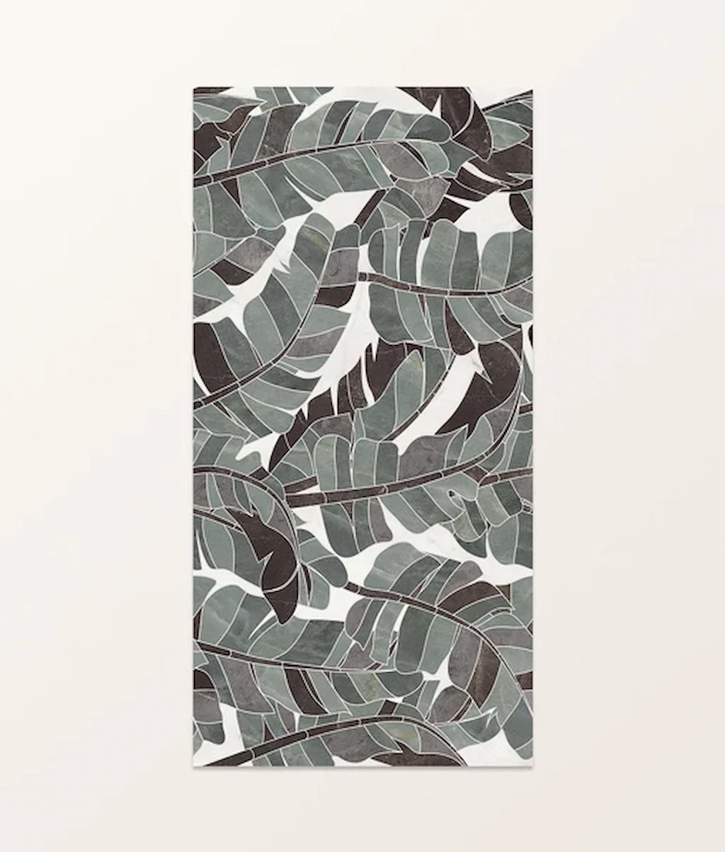 Palmette Sculpted works especially well on shower walls and around baths. The leaf design adds interest, and the calm tone keeps the room feeling