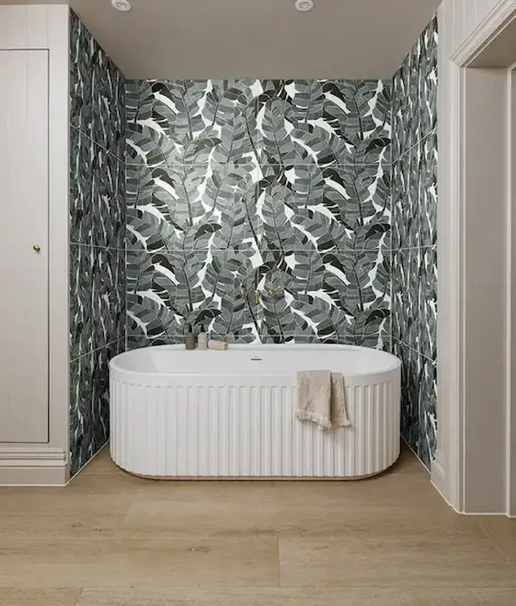 - Zone the room: Use Palmette Sculpted just in the shower or behind the basin to define different areas in an open bathroom.