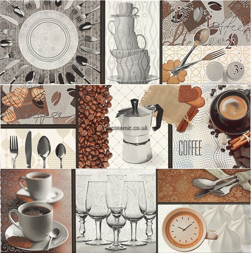 186745 KITCHEN 25x75cm, / 9,84″x29,53″ ST 990 This three-piece mural is perfect for decorating kitchens, It can either be placed at random or together as a set, Colours recommended for combination are white and brown, Contains gold Contains platinum