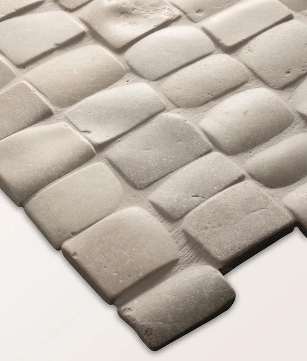 - Look: Sand-toned stone mosaic in a linear cobble layout