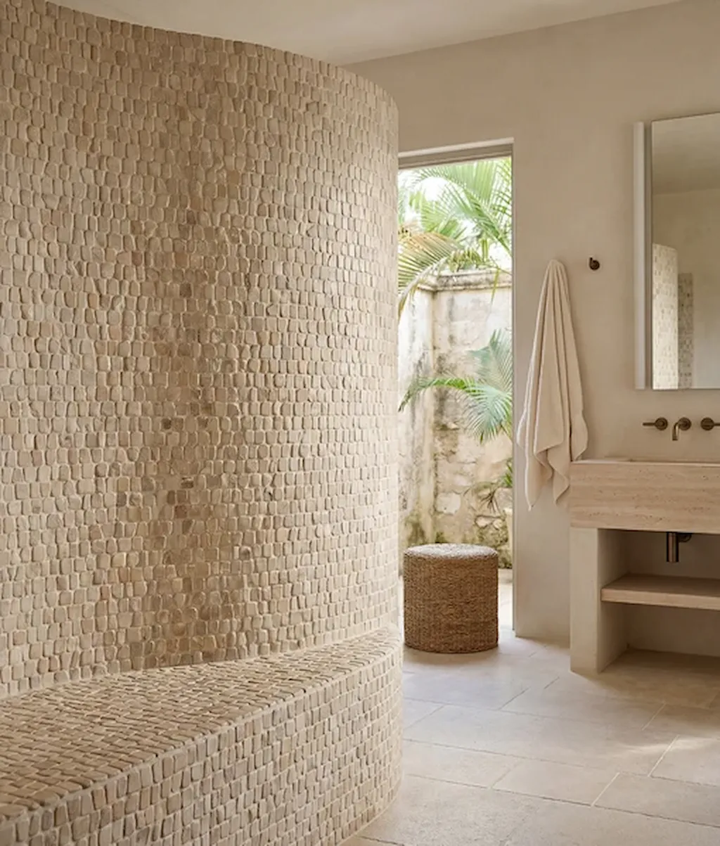 Strip mosaics give a bit more flow than square ones, helping guide the eye across the space. The rounded pieces keep it soft, and the sand colour makes it feel warm and easy to style.