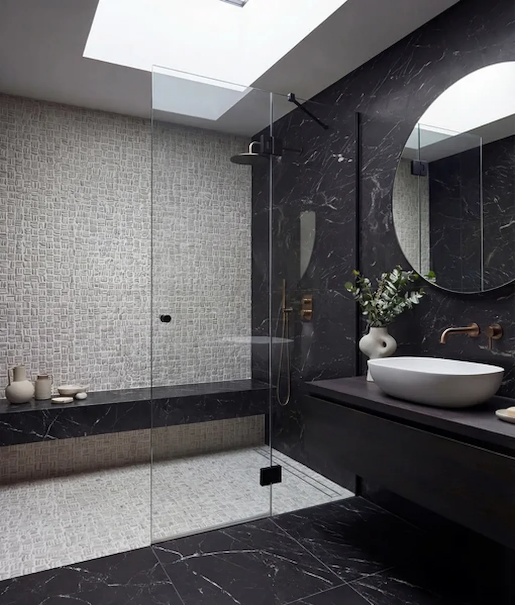 The organic layout adds texture and interest without overwhelming the room. It suits neutral bathrooms, spa-style schemes, and more classic stone-led interiors.