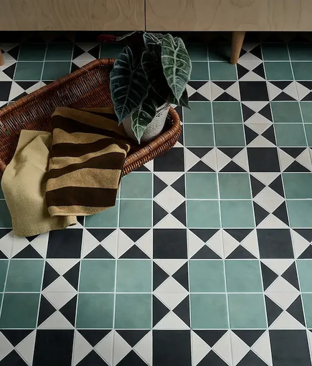 This porcelain tile measures 28x28cm, has a green, white and black pattern resembeling of Victorian floor tiles. A matt porcelain tile suitable for different residential and commercial applications and perfect for both walls and floors. Whether you’re decorating your bathroom, shower, kitchen, hallway, or patio, these tiles promise lasting durability and charm.