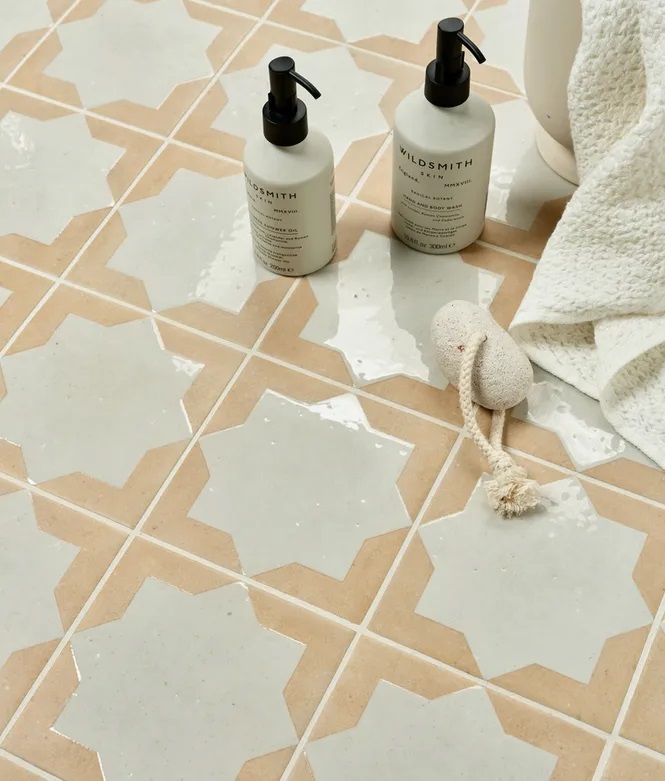 Menara White Star is a decorative porcelain tile, taking inspiration from the Menara Gardens of Marrakesh. It has a beige base with a off-white star design, finished with a mix of matt and gloss textures giving it a traditional yet modern look.