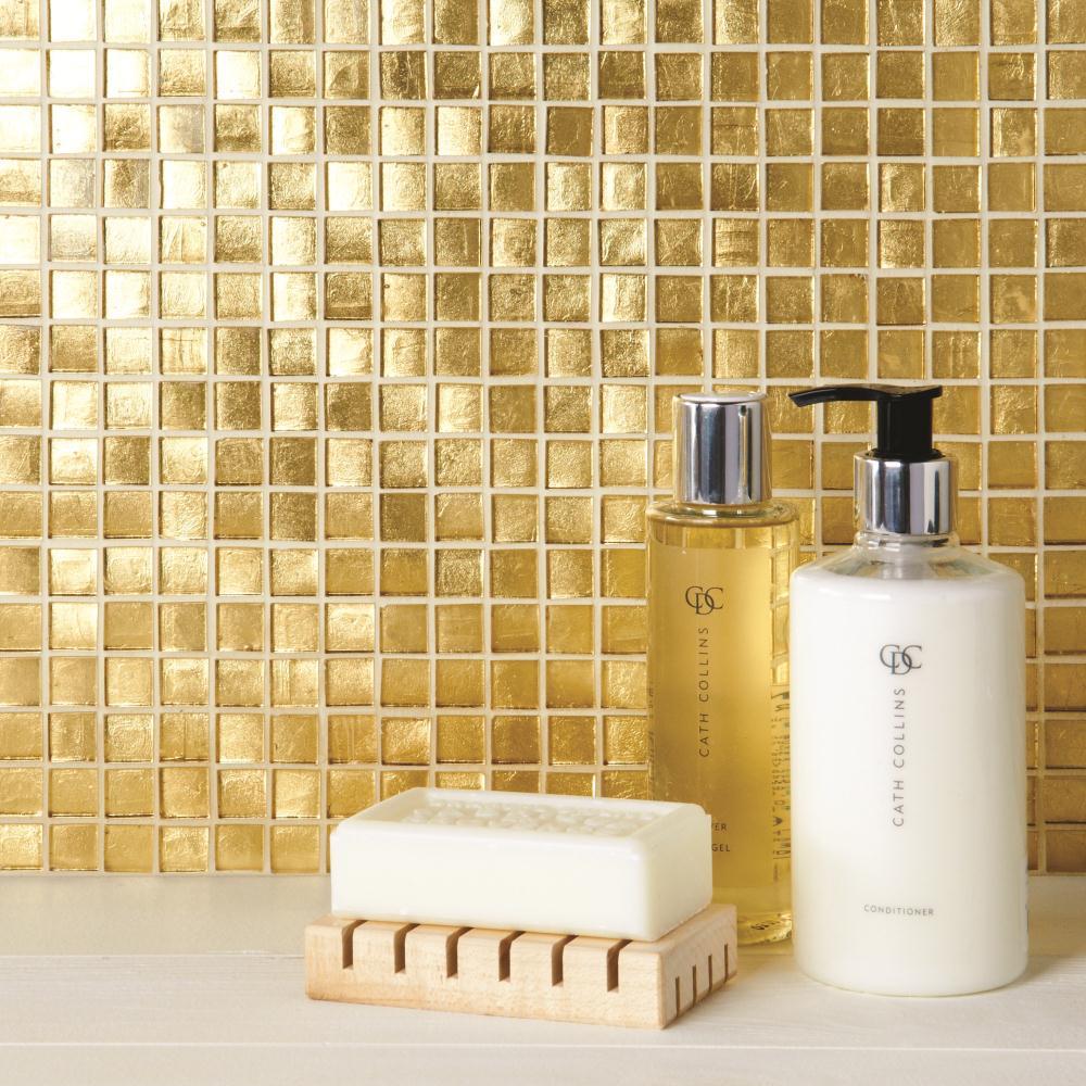 - Modern style decorative gold mosaic tile with a mosaic finish, this item is a ceramic made tile suitable for residential applications; this piece will transform room walls and help in creating exceptional features. Part of the Elite Collection this is a glass mosaic wall tile and it is suitable for indoor projects such as kitchens & bathrooms, sold in 290x290mm sheet quantities; special discounts available for large quantities, simply contact our friendly staff.