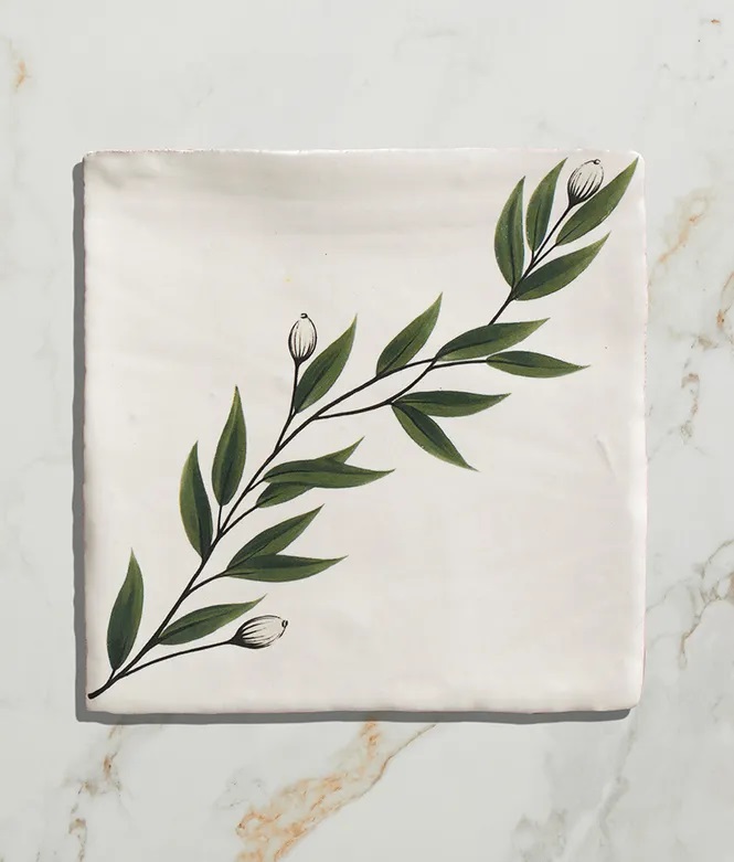 Studio Floreale is a square tile, with a botanical design showing a branch, green leaves, and white buds on a soft, off-white background. Has a soft texture and slightly uneven edges, giving it a unique, handmade look inspired by traditional Italian kitchens.